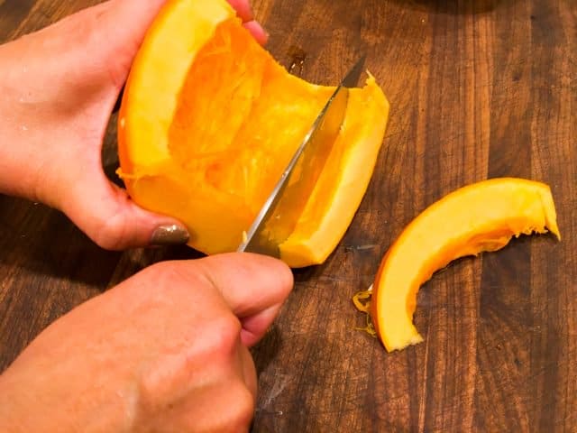 Heat oven to 400F. Using a large metal spoon, scoop out the seeds and insides of the pumpkin. Save the seeds for roasting. Use a sharp chef’s knife to cut slices of pumpkin, 1-inch thick.