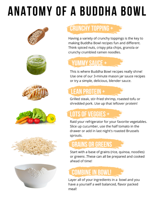 As you know, the base of all Buddha Bowls is a grain like rice, noodles, millet, or quinoa, or a bed of your favorite leafy greens. Some of our favorite grain-free options include riced cauliflower and broccoli, and zucchini, cabbage, or carrot noodles. We typically cook our grains ahead of time, as they store and reheat very well. As you’re prepping for your meals ahead, choose three grains or greens that you’d like to have on hand to make Buddha Bowl building easy throughout your week!