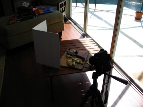 And here was my lighting situation. The light was really harsh that late afternoon, so I kept the food out of the direct light to avoid harsh shadows. The whiteboard helped bounce the light back onto the food.