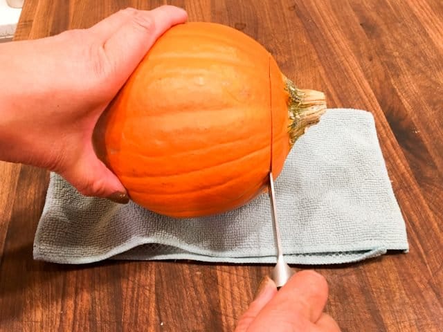 As always, be careful cutting into the round pumpkin. I place the pumpkin on a kitchen towel to prevent slipping.