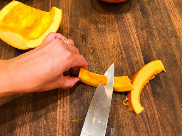 - To cut through the tough skin of the pumpkin, use the tip of a sharp, chef’s knife to first pierce the spot where you want to cut. That gives you a starting point for the blade of your knife to begin. Then nestle your blade into that spot, and gently rock back and forth. Don’t try to muscle it! The waxy surface of the pumpkin can slide on your cutting board.