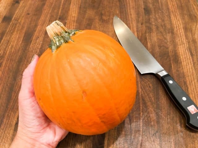 A better option is to buy “Pie Pumpkin” which is a smaller pumpkin. One Pie Pumpkin should feed 6 people.