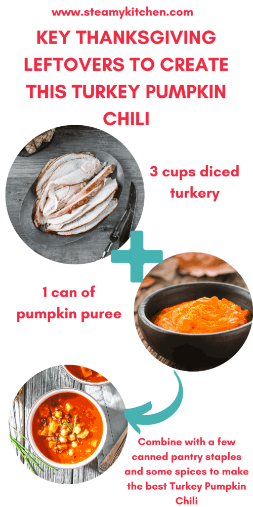 You can only eat so much Thanksgiving foods after the holiday has ended, right? Let’s mix it up with this Leftover Turkey Pumpkin Chili. We still have tons of warm fall flavors and spices, but this is a nice change of pace from the same old turkey plate. Turn your leftovers into something unique.